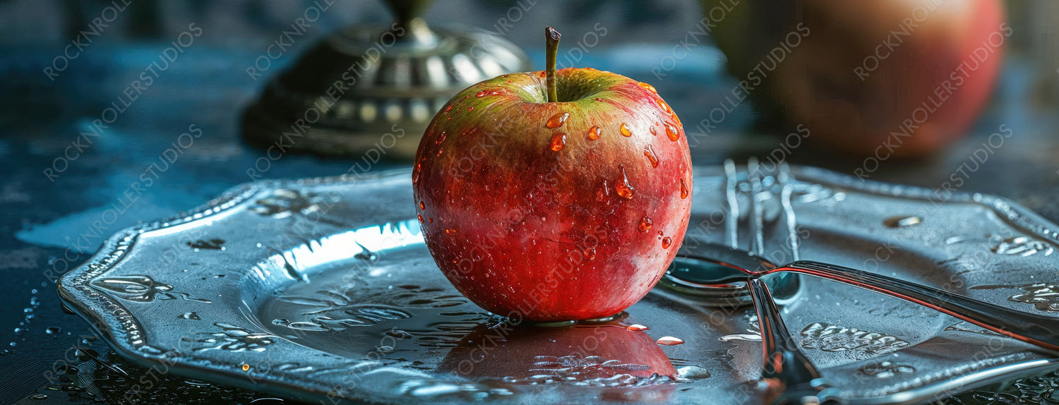 Elegant Antique Dining Scene with Fresh Red Apple on Vintage Silver Plate