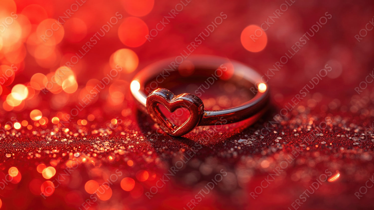 Heart-Shaped Ring on a Glittery Red Surface. Romantic Valentine’s Day Background.