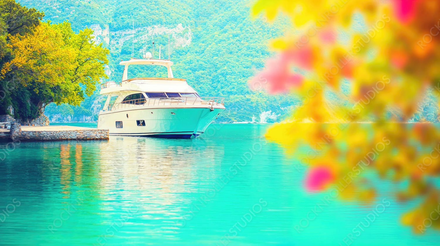 Idyllic Lakeside Luxury: Yacht by Turquoise Waters & Lush Hills